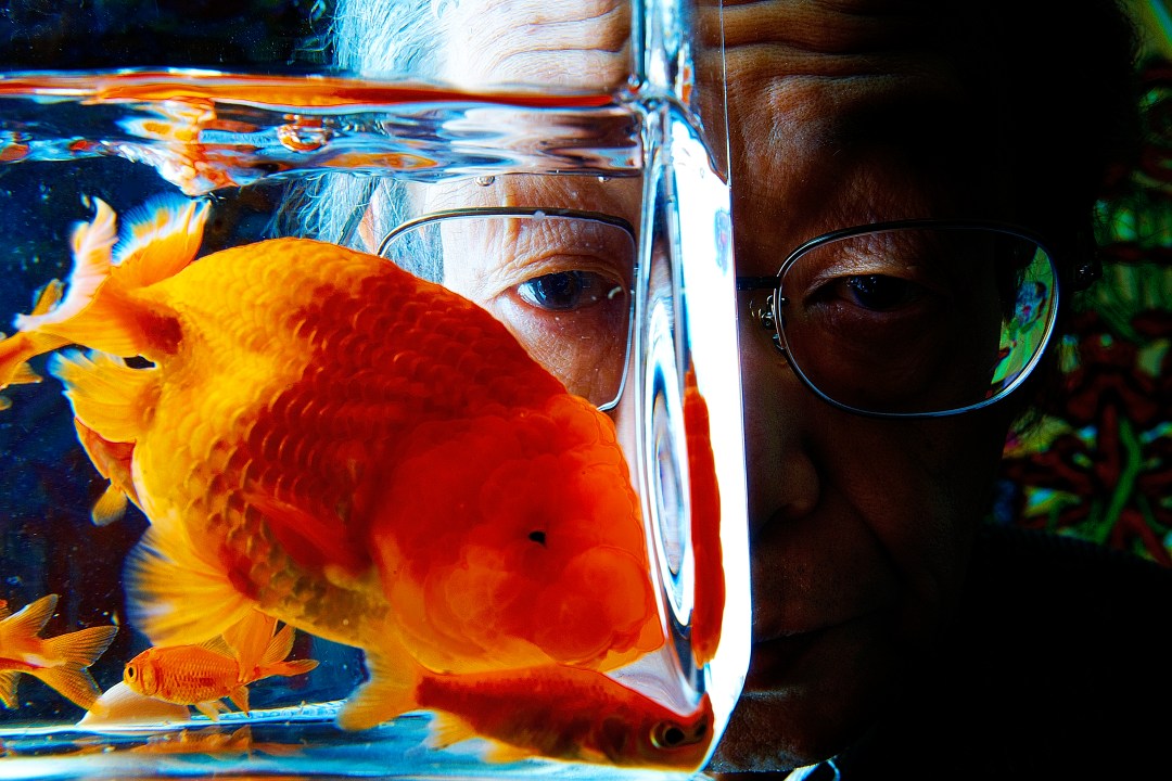 アトリエにお邪魔しての撮影でしたが、ただアトリエにいる田名網先生を撮影するのも面白みがないと思い、先生の作品に頻出する金魚(ちょっと品種は違うのですが…)を持ち込んで撮影しました。
